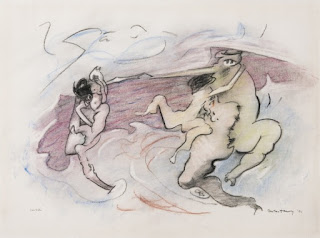 In recent years he has sought a more intuitive approach to painting, allowing rhythm to permeate the labyrinthine web of images forming his compositions. He allows himself to be led by instinct in application of both colour and brushstroke. As we study the paintings, swans, cats and other animals emerge from his canvases in bisecting lines and over-riding contours; these forms are testament to the level of improvisation Head has developed in his practice, as they are integrated only as and when they occur to him whilst painting."
